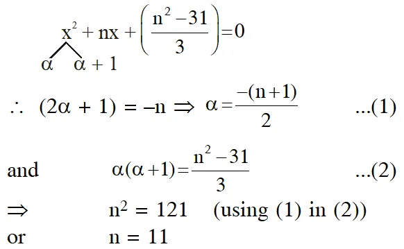 Q. If, for a positive integer n, the quadratic equation, $\mathrm{x}(\mathrm{x}+1)+(\mathrm{x}+1)(\mathrm{x}+2)+\ldots \ldots+(\mathrm{x}+\overline{\mathrm{n}-1})(\mathrm{x}+\mathrm{n})$= 10n has two consecutive integral solutions, then n is equal to : (1) 11 (2) 12 (3) 9 (4) 10 [JEE(Main)-2017]