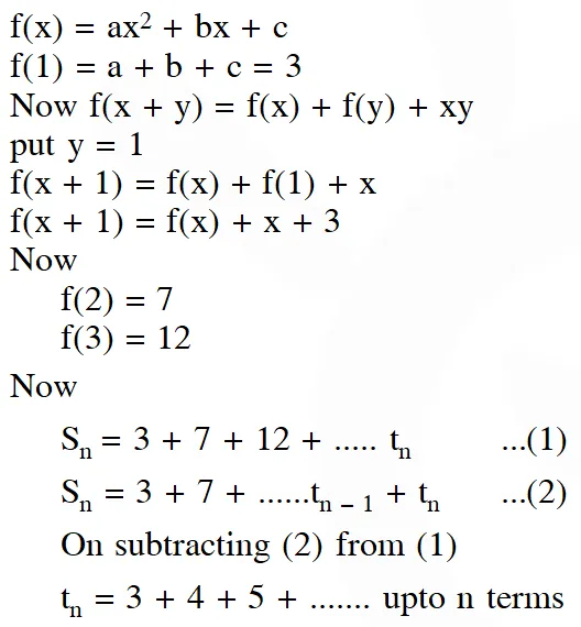 Q. Let $a, b, c \in R .$ If $f(x)=a x^{2}+b x+c$ is such that $a+b+c=3$ and $f(x+y)=f(x)+f(y)+$ $\mathrm{xy}, \forall \mathrm{x}, \mathrm{y} \in \mathrm{R},$ then $\sum_{\mathrm{n}=1}^{10} \mathrm{f}(\mathrm{n})$ is equal to : (1) 255 (2) 330 (3) 165 (4) 190 [JEE(Main)-2017]