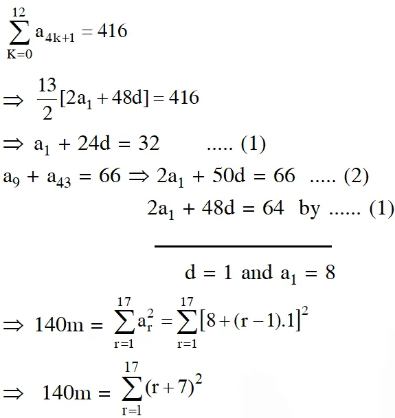 Q. Let $a_{1}, a_{2}, a_{3}, \ldots ., a_{49}$ be in A.P. such that $\sum_{\mathrm{k}=0}^{12} \mathrm{a}_{4 \mathrm{k}+1}$ $=416$ and $a_{9}+a_{43}=66 .$ If $a_{1}^{2}+a_{2}^{2}+\ldots \ldots+a_{17}^{2}$ = 140m, then m is equal to- (1) 68 (2) 34 (3) 33 (4) 66 [JEE(Main)-2018]