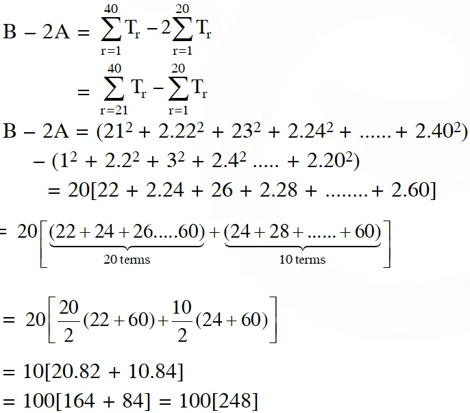 Q. Let A be the sum of the first 20 terms and B be the sum of the first 40 terms of the series $1^{2}+2 \cdot 2^{2}+3^{2}+2 \cdot 4^{2}+5^{2}+2 \cdot 6^{2}+\ldots \ldots \ldots \quad$ If $\mathrm{B}-2 \mathrm{A}=100 \lambda,$ then $\lambda$ is equal to : (1) 248 (2) 464 (3) 496 (4) 232 [JEE(Main)-2018]