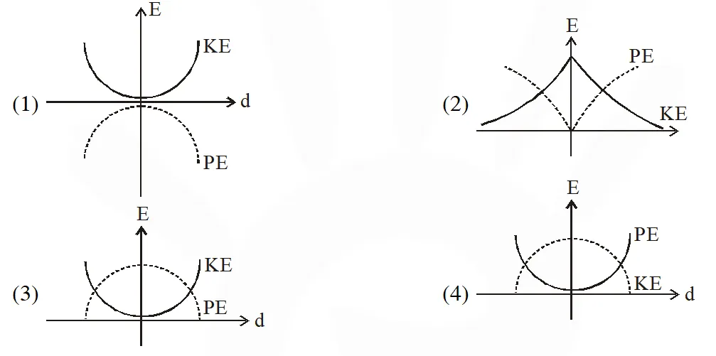 Q. For a simple pendulum, a graph is plotted between its kinetic energy (KE) and potential energy (PE) against its displacement d. Which one of the following represents these correctly ? (graphs are schematic and not drawn to scale)