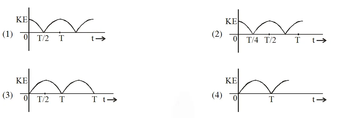 Q. A particle is executing simple harmonic motion with a time period T. AT time t = 0, it is at its position of equilibrium. The kinetic energy-time graph of the particle will look like