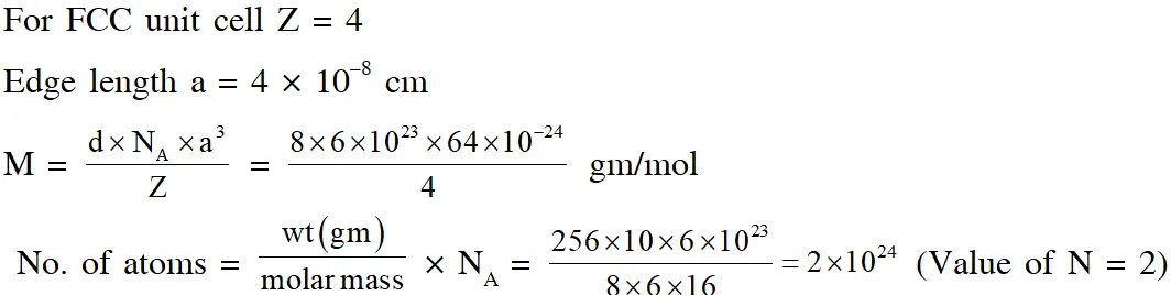 400 pm. If the density of the substance in the crystal is 8g $\mathrm{cm}^{-3}$, then the number of atoms present in 256g of the crystal is $\mathrm{N} \times 10^{24}$. The value of N is