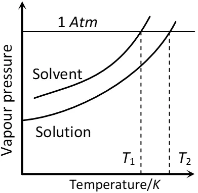 Ans. The diagram shows that solution containing non-volatile solute boils at temperature $T_{2}$ which is higher than boiling point of pure solvent, i.e., $T_{1}$