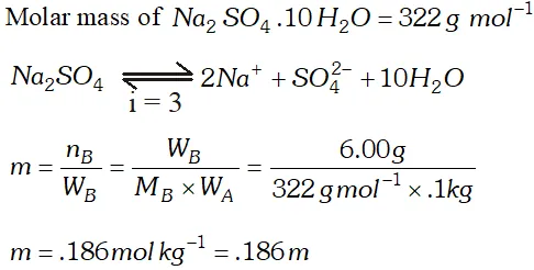 Q. Assuming complete dissociation, calculate the expected freezing point of a solution prepared by dissolving $6.00 \mathrm{g}$ Glaubers salt, $N a_{2} S O_{4}, 10 H_{2} O$ in. 100 kg of $H_{2} O\left[K_{f}=1.86\right.$ $\left.K \mathrm{kg} \mathrm{mol}^{-1}\right)$ [CBSE Board 1998]