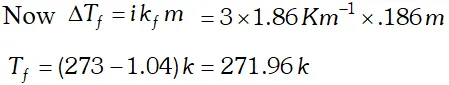 Ans. $\Delta T_{f}=k_{f} \times m$ $\Delta T_{f}=1.86 \times \frac{W_{B}}{M_{B}} \times \frac{1000}{W_{A}}=\frac{1.86 \times 3}{60} \times \frac{1000}{100}=0.93$ Freezing point of solution $=273 K-0.93=272.07 K$