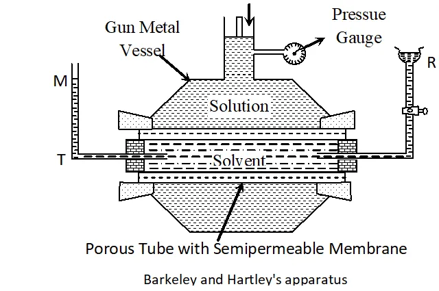Ans. Experimental Measurement of Osmotic Pressure. A number of methods are available for measurement of osmotic pressure. The best out of these is Berkeley and Hartley’s Method. This method is based upon applying pressure on the solution which is just sufficient to prevent the entry of the solvent into the solution through the semi-permeable membrane. The apparatus used by Berkeley and nartley is shown in Figure. It consists of a porous tube (open at both ends) containing the semi-permeable membrance of copper ferrocyanide. The porous tube is fitted with a reservoir R on one side and a tube T on the other. The porous tube is filled with the pure solvent so that the level in the tube T stands at the mark M. The porous tube is fitted into an outer vessel made of gun metal. This vessel has a wide tube at the top which is fitted with a frictionless piston and a pressure gauge as shown in figure. The solution under study is taken in the outer gun metal vessel. As a result of osmosis, the level in the tube tends to fall. The pressure applied on the solution by means of the piston which keeps the level in the tube at is a measure of the osmotic pressure and can be read directly on the pressure gauge. This method is superior to the other methods because of the following reasons :