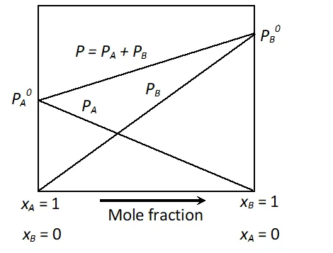 Q. Draw a suitable labelled diagram to express the relationships for ideal solution of A and B between vapour pressure and mole fractions of components at constant temperature. [CBSE 2002; Delhi 2002]