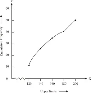 From the table plot the points corresponding to the ordered pairs such as (120, 12), (140, 26), (160, 34), (180, 40) and (200, 50) on graph paper and the plotted points are joined to get a smooth curve and the obtained curve is known as less than type ogive curve