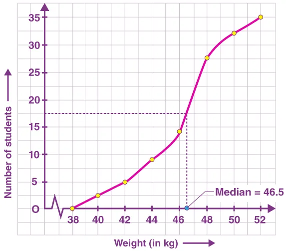 Locate the point 17.5 on the y-axis and draw a line parallel to the x-axis cutting the curve at a point. From the point, draw a perpendicular line to the x-axis. The intersection point perpendicular to x-axis is the median of the given data. Now, to find the median by making a table.