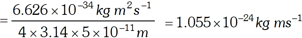 $\Delta x \times \Delta p=\frac{h}{4 \pi}$ $\therefore \quad \Delta p=\frac{h}{4 \pi \Delta x}=\frac{6.626 \times 10^{-34} \mathrm{kg} m^{2} s^{-1}}{4 \times 3.14 \times\left(2 \times 10^{-12} \mathrm{m}\right)}$ $=2.638 \times 10^{-23} \mathrm{kg} \mathrm{ms}^{-1}$ Actual momentum $=\frac{h}{4 \pi \times 0.05 \mathrm{nm}}=\frac{h}{4 \pi \times 5 \times 10^{-11} \mathrm{m}}$