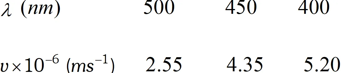 [NCERT] Ans. Suppose threshold wavelength $=\lambda_{0} n m=\lambda_{0} \times 10^{-9} \mathrm{m}$ Then $h\left(v-v_{0}\right)=\frac{1}{2} m v^{2} \quad$ or $\quad h c\left(\frac{1}{\lambda}-\frac{1}{\lambda_{0}}\right)=\frac{1}{2} m v^{2}$ Substituting the given results of the three experiments, we get $\frac{h c}{10^{-9}}\left(\frac{1}{500}-\frac{1}{\lambda_{0}}\right)=\frac{1}{2} m\left(2.55 \times 10^{6}\right)^{2}$ $\frac{h c}{10^{-9}}\left(\frac{1}{450}-\frac{1}{\lambda_{0}}\right)=\frac{1}{2} m\left(4.35 \times 10^{6}\right)^{2}$ $\frac{h c}{10^{-9}}\left(\frac{1}{400}-\frac{1}{\lambda_{0}}\right)=\frac{1}{2} m\left(5.20 \times 10^{6}\right)^{2}$ Dividing equation (ii) by equation (i), we get $\frac{\lambda_{0}-450}{450 \lambda_{0}} \times \frac{500 \lambda_{0}}{\lambda-500}=\left(\frac{4.35}{2.55}\right)^{2}$ or $\quad \frac{\lambda_{0}-450}{\lambda_{0}-500}=\frac{450}{500}\left(\frac{4.35}{2.55}\right)^{2}=2.619$ or $\lambda_{0}-450=2.619 \lambda-1309.5$ or $\quad 1.619 \lambda_{0}=859.5 \quad \therefore \quad \lambda_{0}=531 \mathrm{nm}$ Substituting this value in equation (iii), we get $\frac{h \times\left(3 \times 10^{8}\right)}{10^{-9}}\left(\frac{1}{400}-\frac{1}{531}\right)=\frac{1}{2}\left(9.11 \times 10^{-31}\right)\left(5.20 \times 10^{6}\right)^{2}$ or $\quad h=6.66 \times 10^{-34} \mathrm{Js}$
