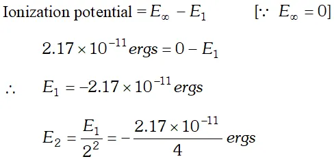 Q. Calculate the wavelength in Angstroms of the photon that is emitted when an electron in Bohr orbit $n=2$ returns to the orbit $n=1$ in the hydrogen atom. The ionisation potential of the ground state of hydrogen atom is $2.17 \times 10^{-11}$ ergs per atom.