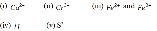 Ans. During the formation of cations, electrons are lost while in the formation of anions, electrons are added to the valence shell. The number of electrons added or lost is equal to the numerical value of the charge present on the ion. Following this general concept, we can write the electronic configurations of all the ions given in the question. (i) $\quad C u^{2+}=_{29} C u-2 e^{-}$ $=1 s^{2} 2 s^{2} 2 p^{6} 3 s^{2} 3 p^{6} 3 d^{10} 4 s^{1}-2 e^{-}$ $=1 s^{2} 2 s^{2} 2 p^{6} 3 s^{2} 3 p^{6} 3 d^{9}$ (ii) $\quad C r^{3+}=_{24} C r-3 e^{-}$ $=1 s^{2} 2 s^{2} 2 p^{6} 3 s^{2} 3 p^{6} 3 d^{5} 4 s^{1}-3 e^{-}$ $=1 s^{2} 2 s^{2} 2 p^{6} 3 s^{2} 3 p^{6} 3 d^{3}$ (iii) $\quad F e^{2+}=_{26} F e-2 e^{-}$ $=1 s^{2} 2 s^{2} 2 p^{6} 3 s^{2} 3 p^{6} 3 d^{6} 4 s^{2}-2 e^{-}$ $=1 s^{2} 2 s^{2} 2 p^{6} 3 s^{2} 3 p^{6} 3 d^{6}$ $=1 s^{2} 2 s^{2} 2 p^{6} 3 s^{2} 3 p^{6} 3 d^{6}$ $F e^{3+}=26 F e-3 e^{-}$ $=1 s^{2} 2 s^{2} 2 p^{6} 3 s^{2} 3 p^{6} 3 d^{5}$ (iv) $\quad H^{-}=_{1} H+1 e^{-}=1 s^{1}+1 e^{1}=1 s^{2}$ (v) $\quad S^{2-}=_{16} S+2 e^{-}$ $=1 s^{2} 2 s^{2} 2 p^{6} 3 s^{2} 3 p_{x}^{2} 3 p_{y}^{1} 3 p_{z}^{1}+2 e^{-}$ $=1 s^{2} 2 s^{2} 2 p^{6} 3 s^{2} 3 p_{x}^{2} 3 p_{y}^{2} 3 p_{z}^{2}$