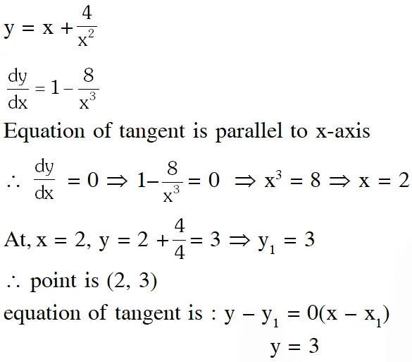 Q. The equation of the tangent to the curve $y=x+\frac{4}{x^{2}},$ that is parallel to the x-axis, is :-