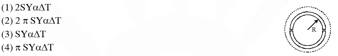 Q. A wooden wheel of radius R is made of two semicircular parts (see figure). The two parts are held together by a ring made of a metal strip of cross sectional area S and Length L. L is slightly less than $2 \pi \mathrm{R}$. To fit the ring on the wheel, it is heated so that its temperature rises by $\Delta \mathrm{T}$ and it just steps over the wheel. As it cools down to surrounding temperature, it presses the semicircular parts together. If the coefficient of linear expansion of the metal is , and its Young's modulus is Y, the force that one part of the wheel applies on the other part is :