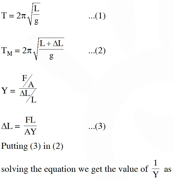 Q. A pendulum made of a uniform wire of cross sectional area A has time period T. When an additional mass M is added to its bob, the time period changes to $\mathrm{T}_{\mathrm{M}}$. If the Young's modulus of the material of the wire is Y then $\frac{1}{\mathrm{Y}}$ is equal to :- (g = gravitational acceleration)