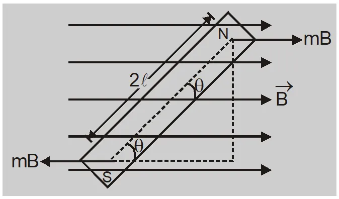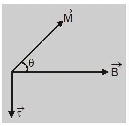 - The bar magnet experiences a torque $\vec{\tau}=\vec{M} \times \vec{B}$ The direction of torque is perpendicular to plane containing $\overrightarrow{ M }$ and $\overrightarrow{ B }$. This torque produces rotational motion of magnet.