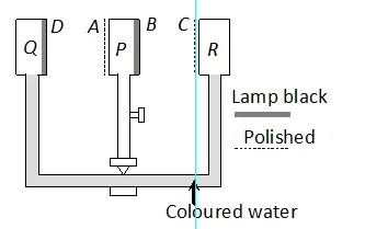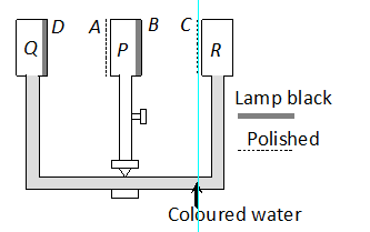 Initially boiling water is filled in vessel P and it is found that no change in the levels of coloured water takes place. Now if the vessel P is rotated through 180°, then the level of coloured water starts moving from Q to R because in this position good absorber faces good emitter (black surface faces black surface) and bad absorber faces bad emitter (Polished surface faces polished surface).