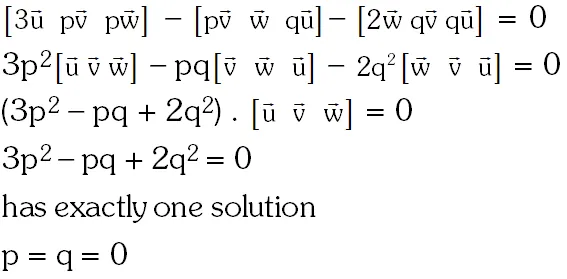 Q. If $\overrightarrow{\mathrm{u}}, \overrightarrow{\mathrm{v}}, \overrightarrow{\mathrm{w}}$ are non-coplanar vectors and $\mathrm{p}, \mathrm{q}$ are real numbers, then the equality $[3 \vec{u} p \vec{v} p \vec{w}]-[p \vec{v} \vec{w} q \vec{u}]-[2 \vec{w} q \vec{v} q \vec{u}]=0$ holds for $:-$
