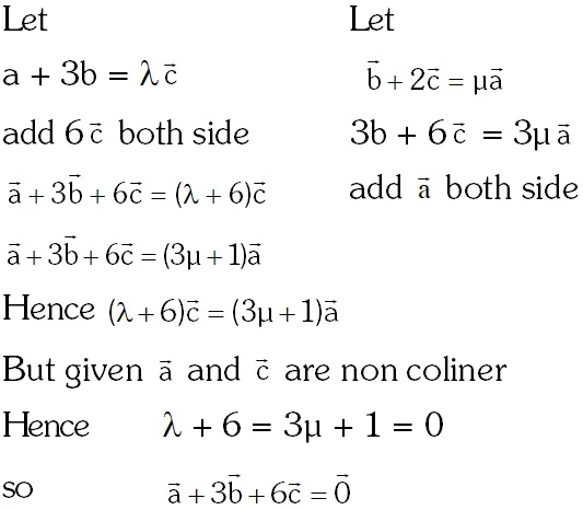 Q. Let $\vec{a}, \vec{b}, \vec{c}$ be three non-zero vectors which are pairwise non-collinear. If $\vec{a}+3 \vec{b}$ is collinear with $\overrightarrow{\mathrm{c}}$ and $\overrightarrow{\mathrm{b}}+2 \overrightarrow{\mathrm{c}}$ is colliner with $\overrightarrow{\mathrm{a}},$ then $\overrightarrow{\mathrm{a}}+3 \overrightarrow{\mathrm{b}}+6 \overrightarrow{\mathrm{c}}$ is: