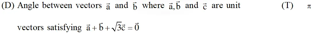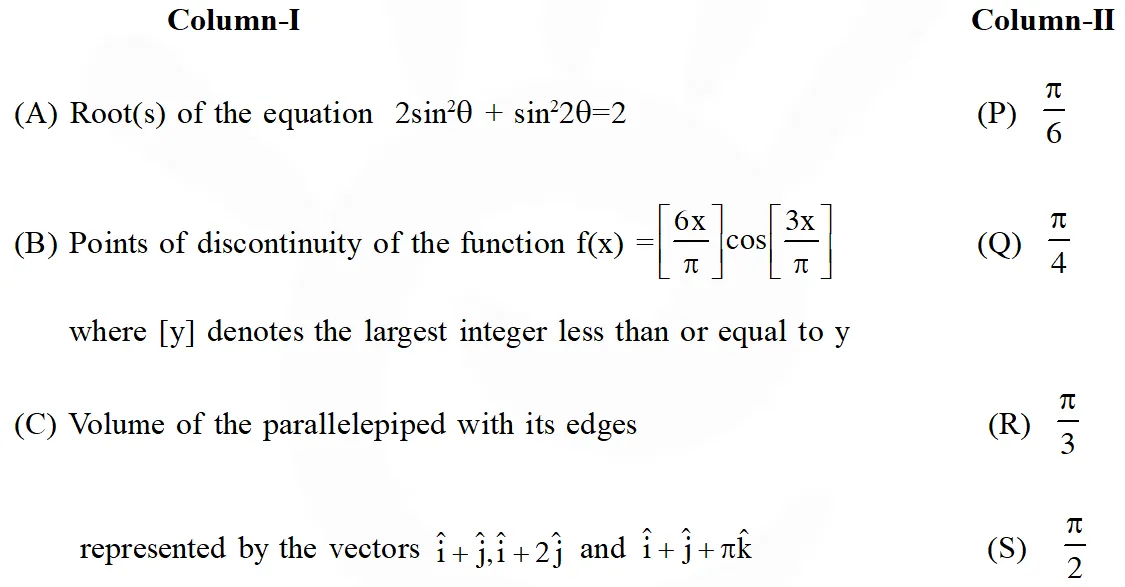 [JEE 2009, 3+8] Ans. ((A) C (B) (A) Q,S (B) P,R,S,T (C) T (D) R ) (A) Let angle between $\overrightarrow{\mathrm{a}}$ and $\overrightarrow{\mathrm{b}}$ be $\theta_{1}, \overrightarrow{\mathrm{c}}$ and $\overrightarrow{\mathrm{d}}$ be $\theta_{2}$ and $\overrightarrow{\mathrm{a}} \times \overrightarrow{\mathrm{b}}$ and $\overrightarrow{\mathrm{c}} \times \overrightarrow{\mathrm{d}}$ be $\theta$ since $(\vec{a} \times \vec{b}) .(\vec{c} \times \vec{d})=1$ $\sin \theta_{1} \sin \theta_{2} \cos \theta=1$ $\theta_{1}=90, \theta_{2}=90, \theta=0$ $\overrightarrow{\mathrm{a}} \perp \overrightarrow{\mathrm{b}}, \overrightarrow{\mathrm{c}} \perp \overrightarrow{\mathrm{d}},(\overrightarrow{\mathrm{a}} \times \overrightarrow{\mathrm{b}}) \|(\overrightarrow{\mathrm{c}} \times \overrightarrow{\mathrm{d}})$ so $\overrightarrow{\mathrm{a}} \times \overrightarrow{\mathrm{b}}=\mathrm{k}(\overrightarrow{\mathrm{c}} \times \overrightarrow{\mathrm{d}})$ and $\quad(\overrightarrow{\mathrm{a}} \times \overrightarrow{\mathrm{b}}) \cdot \overrightarrow{\mathrm{c}}=\mathrm{k}(\overrightarrow{\mathrm{c}} \times \overrightarrow{\mathrm{d}}) \cdot \overrightarrow{\mathrm{c}}$ Case I $(\vec{a} \times \vec{b}) \cdot \vec{d}=k(\vec{c} \times \vec{d}) . \vec{d} \quad \because[\vec{a} \vec{b} \vec{c}]=0$ Case II $\overrightarrow{\mathrm{b}} \cdot(\overrightarrow{\mathrm{a}} \times \overrightarrow{\mathrm{b}})=\mathrm{k} \overrightarrow{\mathrm{b}} \cdot(\overrightarrow{\mathrm{c}} \times \overrightarrow{\mathrm{d}}) \therefore[\overrightarrow{\mathrm{b}} \overrightarrow{\mathrm{c}} \cdot \overrightarrow{\mathrm{d}}]=0$ (A) and (B) are in correct let $\overrightarrow{\mathrm{b}} \| \overrightarrow{\mathrm{d}} \Rightarrow \overrightarrow{\mathrm{b}}=\pm \overrightarrow{\mathrm{d}}$ As $(\overrightarrow{\mathrm{a}} \times \overrightarrow{\mathrm{b}}) \cdot(\overrightarrow{\mathrm{c}} \times \overrightarrow{\mathrm{d}})=1$ $\Rightarrow(\vec{a} \times \vec{b}) \cdot(\vec{c} \times \vec{b})=\pm 1$ $[\overrightarrow{\mathrm{a}} \times \overrightarrow{\mathrm{b}} \overrightarrow{\mathrm{c}} \overrightarrow{\mathrm{b}}]=\pm 1$ $[\overrightarrow{\mathrm{c}} \quad \overrightarrow{\mathrm{b}} \quad \overrightarrow{\mathrm{a}} \times \overrightarrow{\mathrm{b}}]=\pm 1$ $\overrightarrow{\mathrm{c}} \cdot[\overrightarrow{\mathrm{b}} \times(\overrightarrow{\mathrm{a}} \times \overrightarrow{\mathrm{b}})]=\pm 1$ $\overrightarrow{\mathrm{c}} \cdot[\overrightarrow{\mathrm{a}}-(\overrightarrow{\mathrm{b}} \cdot \overrightarrow{\mathrm{a}}) \overrightarrow{\mathrm{b}}]=\pm 1$ $\overrightarrow{\mathrm{c} .} \overrightarrow{\mathrm{a}}=\pm 1 \quad \because \quad \overrightarrow{\mathrm{a}} \cdot \overrightarrow{\mathrm{b}}=0$ Which is contradiction so option (c) is correct let option (d) is correct $\overrightarrow{\mathrm{d}}=\pm \overrightarrow{\mathrm{a}}$ and $\overrightarrow{\mathrm{c}}=\pm \overrightarrow{\mathrm{b}}$ $(\vec{a} \times \vec{b}) \cdot(\vec{c} \times \vec{d})=1$ $(\vec{a} \times \vec{b}) \cdot(\vec{b} \times \vec{a})=\pm 1$ so (d) incorrect (B) $(\mathrm{A}) 2 \sin ^{2} \theta+\sin ^{2} 2 \theta=2$ $\sin ^{2} 2 \theta=2 \cos ^{2} \theta$ $4 \sin ^{2} \theta \cos ^{2} \theta=2 \cos ^{2} \theta$ $\cos ^{2} \theta=0$ or $\sin ^{2} \theta=\frac{1}{2}$ $\theta=\frac{\pi}{2}$ or $\sin 0=\pm \frac{1}{\sqrt{2}}$ $\theta=\frac{\pi}{2}, \pm \frac{\pi}{4}$ (B) $\mathrm{f}(\mathrm{x})=\left[\frac{6 \mathrm{x}}{\pi}\right] \cos \left[\frac{3 \mathrm{x}}{\pi}\right]$ possible point of discontinuty of $\left[\frac{6 \mathrm{x}}{\pi}\right]$ $\frac{6 \mathrm{x}}{\pi}=\mathrm{n}, \mathrm{n} \in \mathrm{I}$ $x=\frac{n \pi}{6}$ $\Rightarrow \mathrm{x}=\frac{\pi}{6}, \frac{\pi}{3}, \frac{\pi}{2}, \pi$ Lt $f(x)=1 \cos 0=1$ $\mathrm{x} \rightarrow \frac{\pi^{+}}{6}$ $\mathrm{Lt}-\mathrm{f}(\mathrm{x})=0 \cos 0=0$ $\mathrm{X} \rightarrow \frac{\pi^{-}}{6}$ disconti at $x=\frac{\pi}{6}$ similarly $x=\frac{\pi}{3}, \frac{\pi}{2}, \pi$ (C) Here $\mathrm{v}=\left|\begin{array}{ccc}{1} & {1} & {0} \\ {1} & {2} & {0} \\ {1} & {1} & {\pi}\end{array}\right|=\pi \mathrm{cm}^{3}$ (d) Given $\overrightarrow{\mathrm{a}}+\overrightarrow{\mathrm{b}}+\sqrt{3} \overrightarrow{\mathrm{c}}=0$ $\overrightarrow{\mathrm{a}}+\overrightarrow{\mathrm{b}}=-\sqrt{3} \overrightarrow{\mathrm{c}}$ $|\overrightarrow{\mathrm{a}}+\overrightarrow{\mathrm{b}}|^{2}=|\sqrt{3} \overrightarrow{\mathrm{c}}|^{2}$ $a^{2}+b^{2}+2 \vec{a} \cdot \vec{b}=3 c^{2}$ $2+\cos \theta=3$ $\cos \theta=\frac{1}{2}$ $\theta=\frac{\pi}{3}$