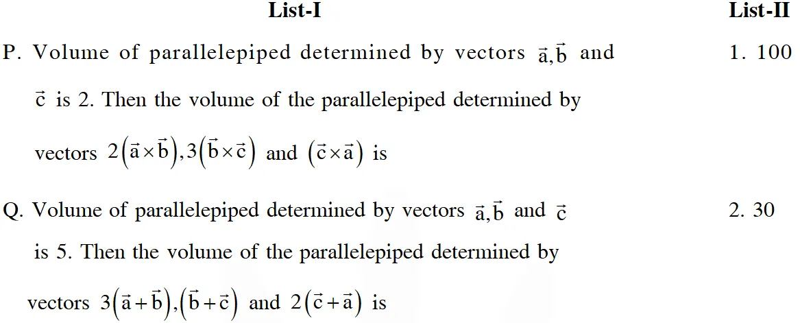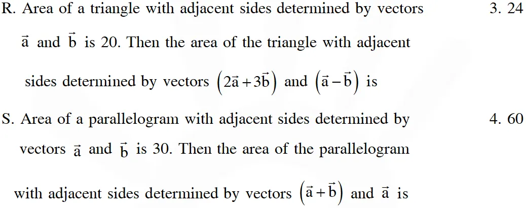 [JEE-Advanced 2013, 3, (–1)] Ans. (C) (P) Given $[\overrightarrow{\mathrm{a}} \overrightarrow{\mathrm{b}} \overrightarrow{\mathrm{c}}]=2$ $[2(\vec{a} \times \vec{b}) 3(\vec{b} \times \vec{c})(\vec{c} \times \vec{a})]=6[\vec{a} \times \vec{b} \quad \vec{b} \times \vec{c} \vec{c} \times \vec{a}]$ $=6[\vec{a} \vec{b} \vec{c}]^{2}=24$ (Q) Given $[\overrightarrow{\mathrm{a}} \overrightarrow{\mathrm{b}} \overrightarrow{\mathrm{c}}]=5$ $[3(\vec{a}+\vec{b})(\vec{b}+\vec{c}) 2(\vec{c}+\vec{a})]=12[\vec{a} \vec{b} \vec{c}]=60$ (R) Given $\frac{1}{2}|\overrightarrow{\mathrm{a}} \times \overrightarrow{\mathrm{b}}|=20$ $\Rightarrow|\overrightarrow{\mathrm{a}} \times \overrightarrow{\mathrm{b}}|=40$ $\left|\frac{1}{2}(2 \vec{a}+3 \vec{b}) \times(\vec{a}-\vec{b})\right|=\frac{1}{2}|0+3 \vec{b} \times \vec{a}-2 \vec{a} \times \vec{b}|$ $=\frac{1}{2}|-5 \overrightarrow{\mathrm{a}} \times \overrightarrow{\mathrm{b}}|=\frac{5}{2}|\overrightarrow{\mathrm{a}} \times \overrightarrow{\mathrm{b}}|=\frac{5}{2} \cdot 40=100$ (S) Given $|\overrightarrow{\mathrm{a}} \times \overrightarrow{\mathrm{b}}|=30$ $|(\vec{a}+\vec{b}) \times \vec{a}|=|0+\vec{b} \times \vec{a}|=30$