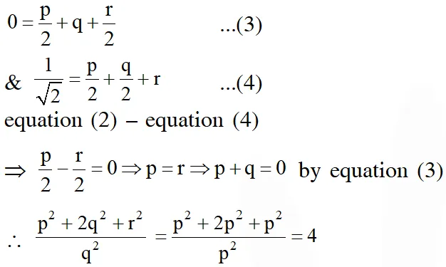 Q. Let $\overrightarrow{\mathrm{a}}, \overrightarrow{\mathrm{b}},$ and $\overrightarrow{\mathrm{c}}$ be three non-coplanar unit vectors such the angle between every pair of them is $\frac{\pi}{3} \cdot$ If $\overrightarrow{\mathrm{a}} \times \overrightarrow{\mathrm{b}}+\overrightarrow{\mathrm{b}} \times \overrightarrow{\mathrm{c}}=\mathrm{p} \overrightarrow{\mathrm{a}}+\mathrm{qb}+\mathrm{r} \overrightarrow{\mathrm{c}},$ where $\mathrm{p}, \mathrm{q}$ and $\mathrm{r}$ are scalars, then the value of $\frac{\mathrm{p}^{2}+2 \mathrm{q}^{2}+\mathrm{r}^{2}}{\mathrm{q}^{2}}$ is [JEE(Advanced)-2014, 3]