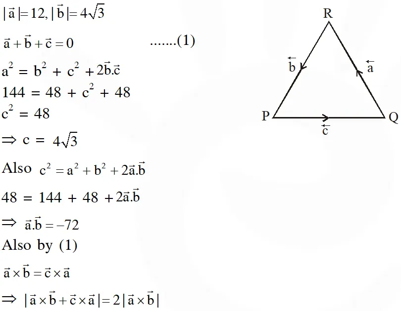 Q. Let $\Delta \mathrm{PQR}$ be a triangle. Let $\overrightarrow{\mathrm{a}}=\overrightarrow{\mathrm{QR}}, \overrightarrow{\mathrm{b}}=\overrightarrow{\mathrm{RP}}$ and $\overrightarrow{\mathrm{c}}=\overrightarrow{\mathrm{PQ}} .$ If $|\overrightarrow{\mathrm{a}}|=4 \sqrt{3}$ and $\overrightarrow{\mathrm{b} . \overrightarrow{\mathrm{c}}}=24$ then which of the following is (are) true? (A) $\frac{|\overrightarrow{\mathrm{c}}|^{2}}{2}-|\overrightarrow{\mathrm{a}}|=12$ (B) $\frac{|\overrightarrow{\mathrm{c}}|^{2}}{2}+|\overrightarrow{\mathrm{a}}|=30$ (C) $|\overrightarrow{\mathrm{a}} \times \overrightarrow{\mathrm{b}}+\overrightarrow{\mathrm{c}} \times \overrightarrow{\mathrm{a}}|=48 \sqrt{3}$ (D) $\overrightarrow{\mathrm{a}} \cdot \overrightarrow{\mathrm{b}}=-72$ [JEE 2015, 4M, –2M]