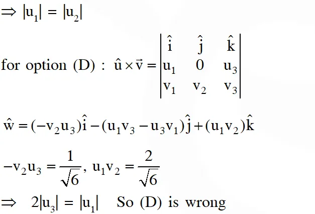 Q. Let $\hat{\mathbf{u}}=\mathbf{u}_{1} \hat{\mathbf{i}}+\mathbf{u}_{2} \hat{\mathbf{j}}+\mathbf{u}_{3} \hat{\mathbf{k}}$ be a unit vector in $\mathbb{U}^{2}$ and $\hat{\mathbf{w}}=\frac{1}{\sqrt{6}}(\hat{\mathbf{i}}+\hat{\mathbf{j}}+2 \hat{\mathbf{k}}) .$ Given that there exists a vector $\overrightarrow{\mathrm{v}}$ in $\square^{3}$ such that $|\hat{\mathrm{u}} \times \overrightarrow{\mathrm{v}}|=1$ and $\hat{\mathrm{w}} .(\hat{\mathrm{u}} \times \overrightarrow{\mathrm{v}})=1 .$ Which of the following statement(s) is(are) correct? (A) There is exactly one choice for such $\overrightarrow{\mathrm{v}}$ (B) There are infinitely many choice for such $\overrightarrow{\mathrm{v}}$ (C) If \hat{u lies in the xy-plane then } $\left|\mathrm{u}_{1}\right|=\left|\mathrm{u}_{2}\right|$ (D) If ú lies in the xz-plane then $2\left|u_{1}\right|=\left|u_{3}\right|$ [JEE(Advanced) 2016]