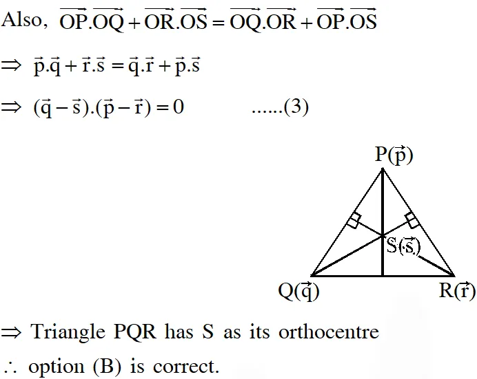 Let position vector of $\mathrm{P}(\overrightarrow{\mathrm{p}}), \mathrm{Q}(\overrightarrow{\mathrm{q}}), \mathrm{R}(\overrightarrow{\mathrm{r}}) \& \mathrm{S}(\overrightarrow{\mathrm{r}})$ with respect to $\mathrm{O}(\overrightarrow{\mathrm{o}})$ Now, $\overrightarrow{\mathrm{OP}} \cdot \overrightarrow{\mathrm{OQ}}+\overrightarrow{\mathrm{OR}} \cdot \overrightarrow{\mathrm{OS}}=\overrightarrow{\mathrm{OR}} \cdot \overrightarrow{\mathrm{OP}}+\overrightarrow{\mathrm{OQ}} \cdot \overrightarrow{\mathrm{OS}}$ $\Rightarrow \overrightarrow{\mathrm{p}} \cdot \overrightarrow{\mathrm{q}}+\overrightarrow{\mathrm{r}} \cdot \overrightarrow{\mathrm{s}}=\overrightarrow{\mathrm{r}} \cdot \overrightarrow{\mathrm{p}}+\overrightarrow{\mathrm{q}} \cdot \overrightarrow{\mathrm{s}}$ $\Rightarrow(\overrightarrow{\mathrm{p}}-\overrightarrow{\mathrm{s}}) \cdot(\overrightarrow{\mathrm{q}}-\overrightarrow{\mathrm{r}})=0$ .....(1) Also, $\overrightarrow{\mathrm{OR}} \cdot \overrightarrow{\mathrm{OP}}+\overrightarrow{\mathrm{OQ}} \cdot \overrightarrow{\mathrm{OS}}=\overrightarrow{\mathrm{OQ}} \cdot \overrightarrow{\mathrm{OR}}+\overrightarrow{\mathrm{OP}} \cdot \overrightarrow{\mathrm{OS}}$ $\Rightarrow \overrightarrow{\mathrm{r}} \cdot \overrightarrow{\mathrm{p}}+\overrightarrow{\mathrm{q}} \cdot \overrightarrow{\mathrm{s}}=\overrightarrow{\mathrm{q}} \cdot \overrightarrow{\mathrm{r}}+\overrightarrow{\mathrm{p}} \cdot \overrightarrow{\mathrm{s}}$ \[ \Rightarrow(\overrightarrow{\mathrm{r}}-\overrightarrow{\mathrm{s}}) \cdot(\overrightarrow{\mathrm{p}}-\overrightarrow{\mathrm{q}})=0 \] ......(2)