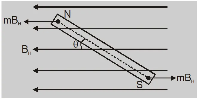 When a bar magnet suspended freely in a uniform magnetic field is displaced from its equilibrium position it starts executing simple harmonic motion about the equilibrium position. The torque acting on magnet is $\tau=-m B_{H}(2 \ell \sin \theta)=$ $- MB _{ H } \sin \theta$ –ive sign shows that torque acts in the direction of decreasing $\theta$. If $\theta$ is small $\tau=- MB _{ H } \theta$